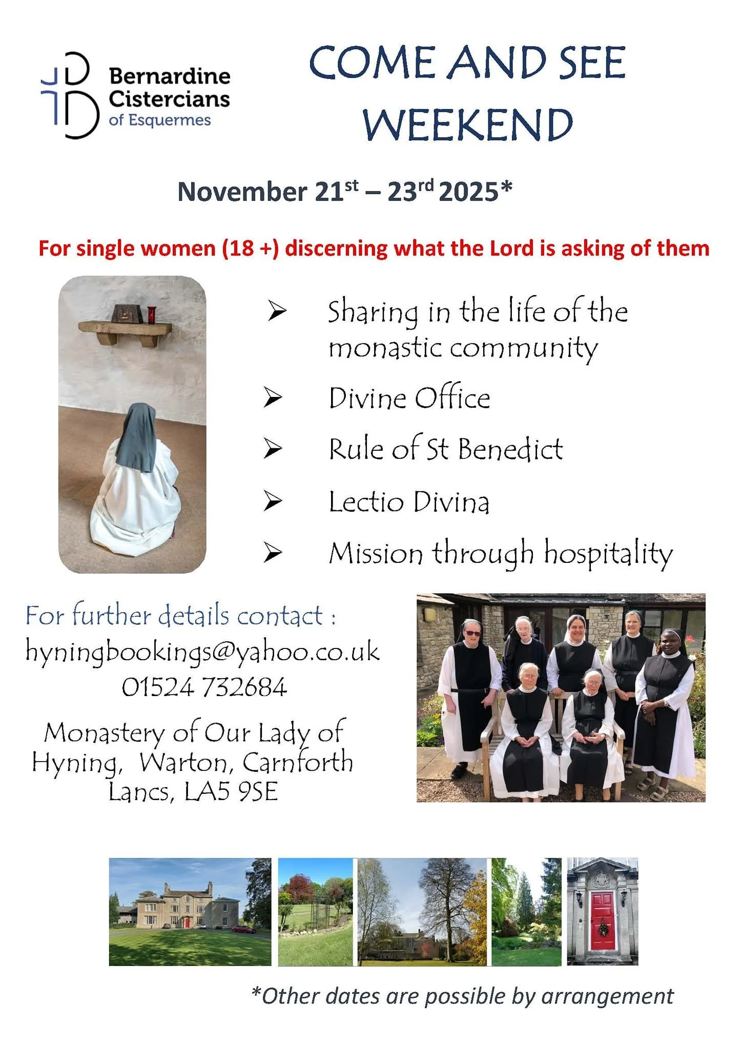 Come and See Weekends are held each year. Please contact hyningbookings@yahoo.co.uk for more details. Please click here for help on vocation discernment in general. The next one is from November 21st - 23rd. Vocations enquiries are welcome to stay anytime.
