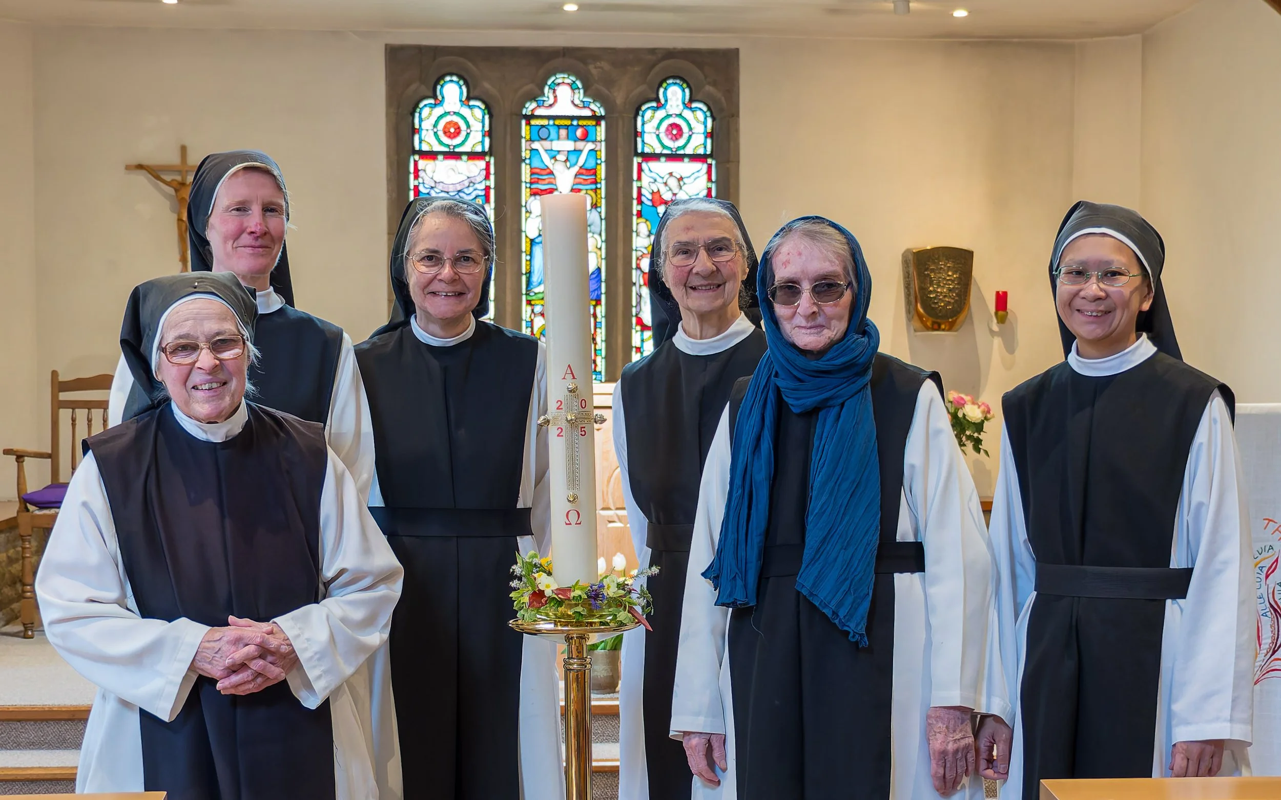 The Community in April 2025 (from right to left): Sister Michelle Marie, Sr Hilda, Sr Maria, Sr Mary Philippa, Sr Catherine, Sr Reina,