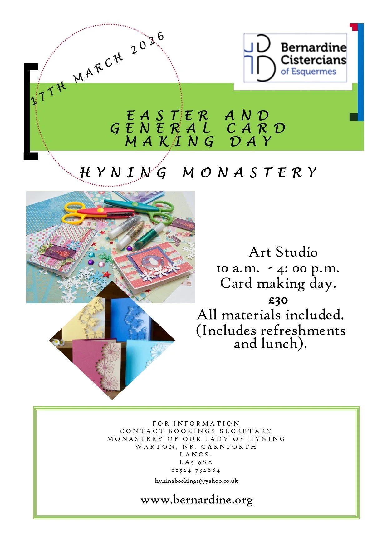Christmas Card making day £35 all materials included, plus refreshments and a cooked lunch. Booking needed, please contact Sr. Mary Bernard at hyningbookings.yahoo.co.uk