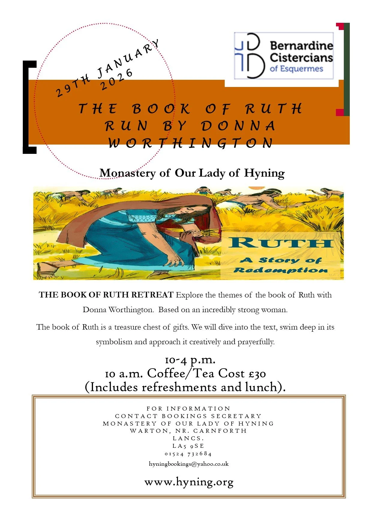 THE BOOK OF RUTH RETREAT Explore the themes of the book of Ruth with Donna Worthington. Based on an incredibly strong woman,The book of Ruth is a treasure chest of gifts. We will dive into the text, swim deep in its symbolism and approach it creatively and prayerfully. £30 with refreshments and cooked lunch. Please book in advance with Sr. Mary Bernard. hyningbookings@yahoo.co.uk